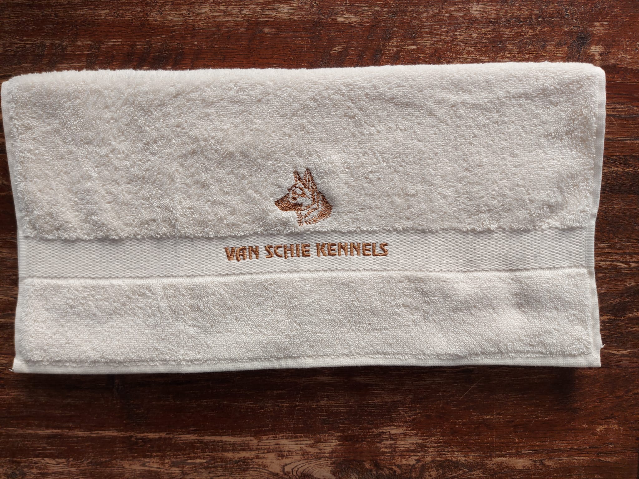 Handdoek met herderlogo + (kennel)naamFunnies handdoekmaat: 100×50 cmmateriaal: 100% katoengeborduurde…